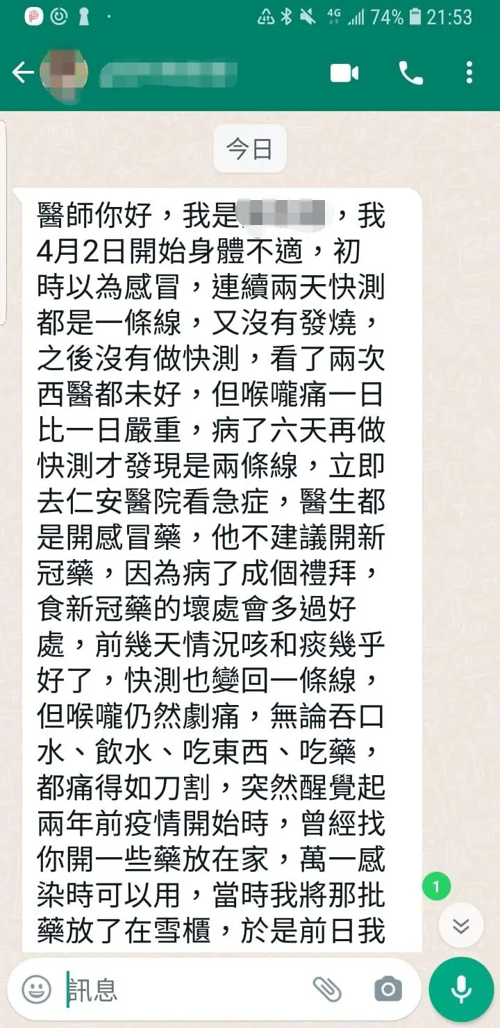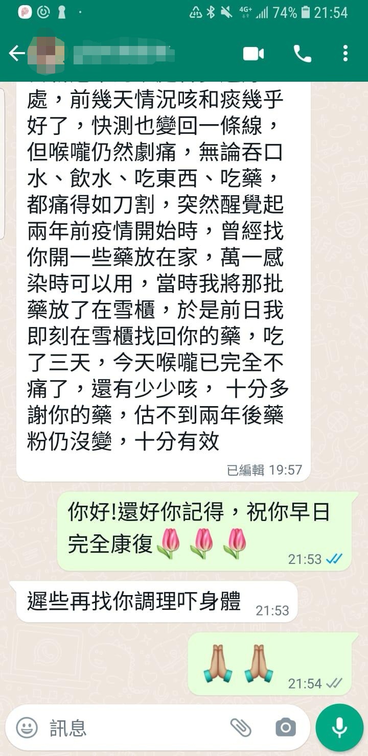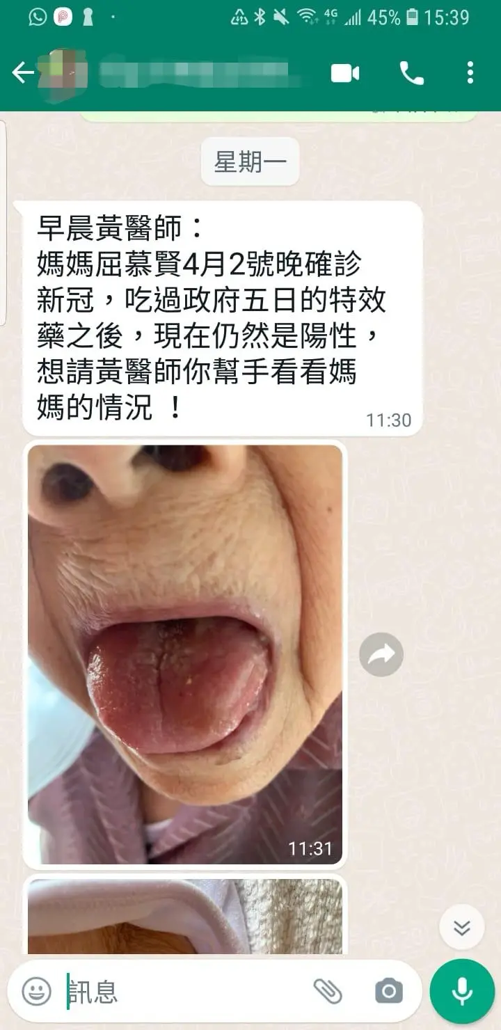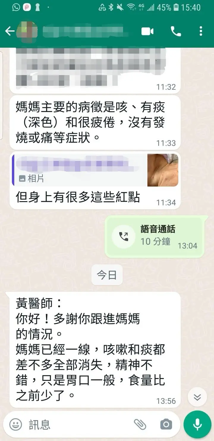 黃博士遙距線上診症,經過治療後轉陰、呼吸道症狀也幾乎完全消失!!