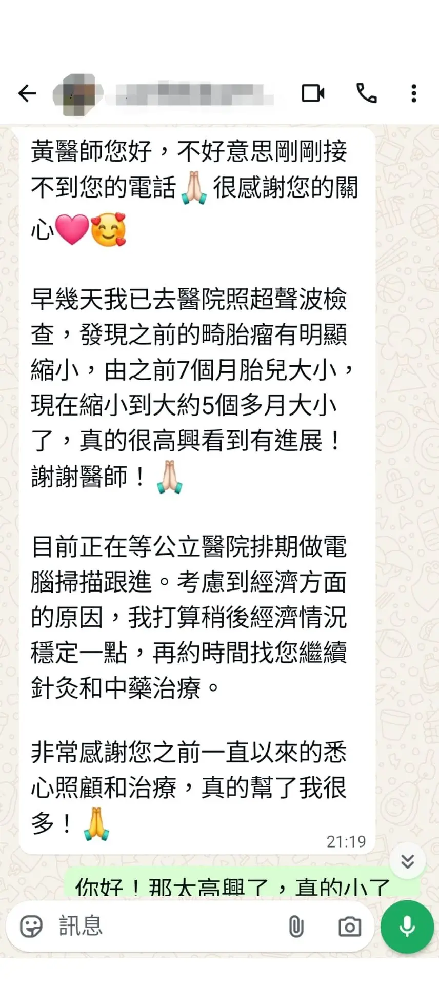 之前每星期嚟覆診,都係我最期待最放鬆的時刻。您嘅醫術真係好精湛,幫我一步步調理身體;最重要係爸爸病的時候,係做IVF吾順利的時候,您每次都好有耐性咁鼓勵我,畀我好大動力堅持落去。每次見到您,我都覺得好開心,好放鬆,有個可靠嘅人陪住我一齊努力。冇您嘅中藥同關心,我唔知會唔會咁快等到呢一刻。
